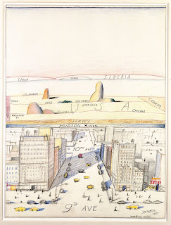 Pieces like "Wyoming" (1969) above demonstrated his love of graphic imagery and whimsical sense of humor. Those of us who only knew his later work, which was sketchier and more stylized, especially the posthumous publishing the New Yorker is doing now, owe it to themselves to see the livelier artworks. Copyright the Saul Steinberg Foundation / Artists Rights Society (ARS), NY.