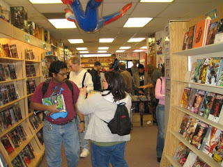 On FCBD, a neighbor and I loaded up his minivan with kids - my 9-year-old daughter, a friend of hers, and his 7 and 4-year old daughters. We cruised into the city on 14th St, and drove right past Big Monkey Comics' new home. They had formerly been in Georgetown, but moved in March to 1722-B 14th St, NW (202-333-8650). The store has a couple of signs, and a monkey on the 2nd floor window. After going up a narrow stairway, we got into the store which was fairly crowded with a twenty-something average customer. The free comics were set up in the back room where the new comics racks are - the kids (and adults) each got to pick 3 comics and they also were giving away sets of bagged back issues. The kids all went out into the small hallway and started reading their comics while I took a quick look around. I'd say the store has less stock than it did on Wisconsin Avenue, but it has a little more space, some of which was being used for a table for a Heroclix game. The staff was friendly, and all wore FCBD shirts that made them easily identifiable.