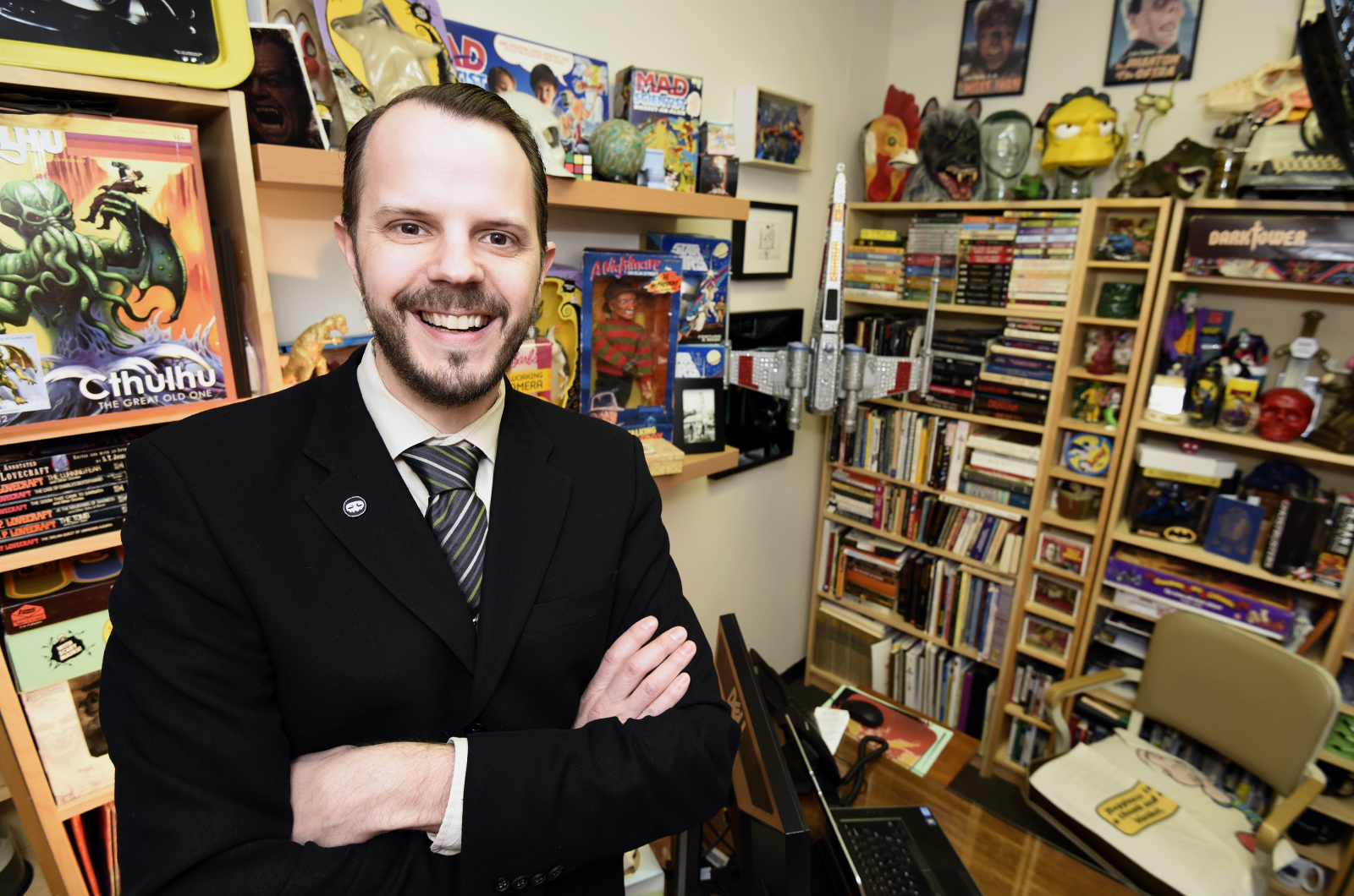 Both Wodzianski and his art are quirky and memorable. The art he creates reflects pop culture, particularly pop culture from his childhood growing up in northwest Pennsylvania. He is a fan of film ephemera, and he incorporates that interest into his art. For instance, this summer he created a series of color theory exercises on blueprints of vehicles that were used in the television show “Star Trek.” That series was juried into a group exhibit “Emulsion” that will take place in March at the Pepco Edison Place Gallery in Washington, D.C. His office at CSM reflects his interest in film, science fiction and horror as well. Students who visit his office are met with walls covered with posters from old horror movies, skulls placed amid the books and games on his shelves, and fantasy and superhero collectible figures studding the walls, shelves and ceiling.