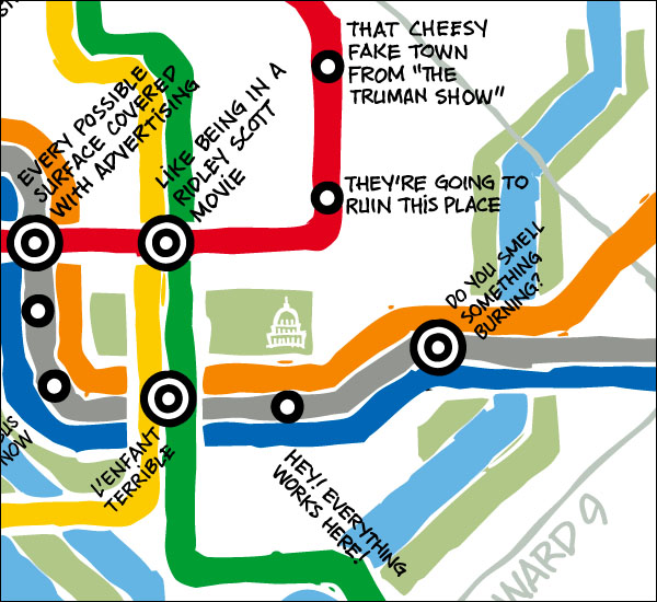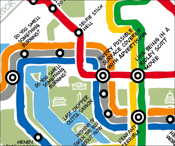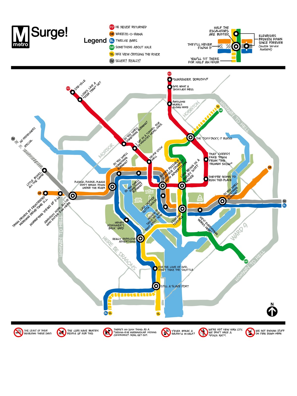This parody is a "truth in labeling" version of the current WMATA subway map poster seen in rail stations and train cars.