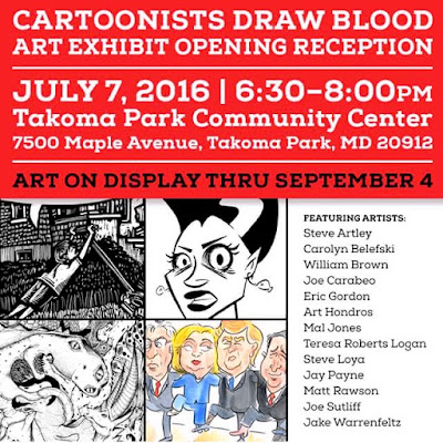 Cartoonists Draw Blood art exhibit at the Takoma Park Community Center, 7/7/2016