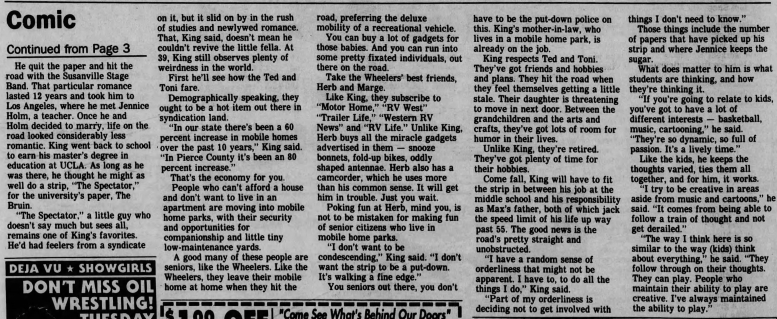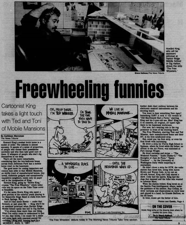 *Merryman, Kathleen. 1991. Freewheeling Funnies: Cartoonist King takes a light touch with Ted and Toni of Mobile Mansions [Howard King, The Free Wheelers]. Tacoma News Tribune (August 5): 3-4. Scan online at https://www.dailycartoonist.com/wp-content/uploads/2026/03/howie-king-feature-story-The_News_Tribune_1991_08_05.jpg and https://www.dailycartoonist.com/wp-content/uploads/2026/03/howie-king-feature-story-2-The_News_Tribune_1991_08_05.jpg